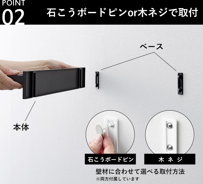 ピンと木ネジ両方付属しているので、設置予定の壁の材質にあわせてお使いください。