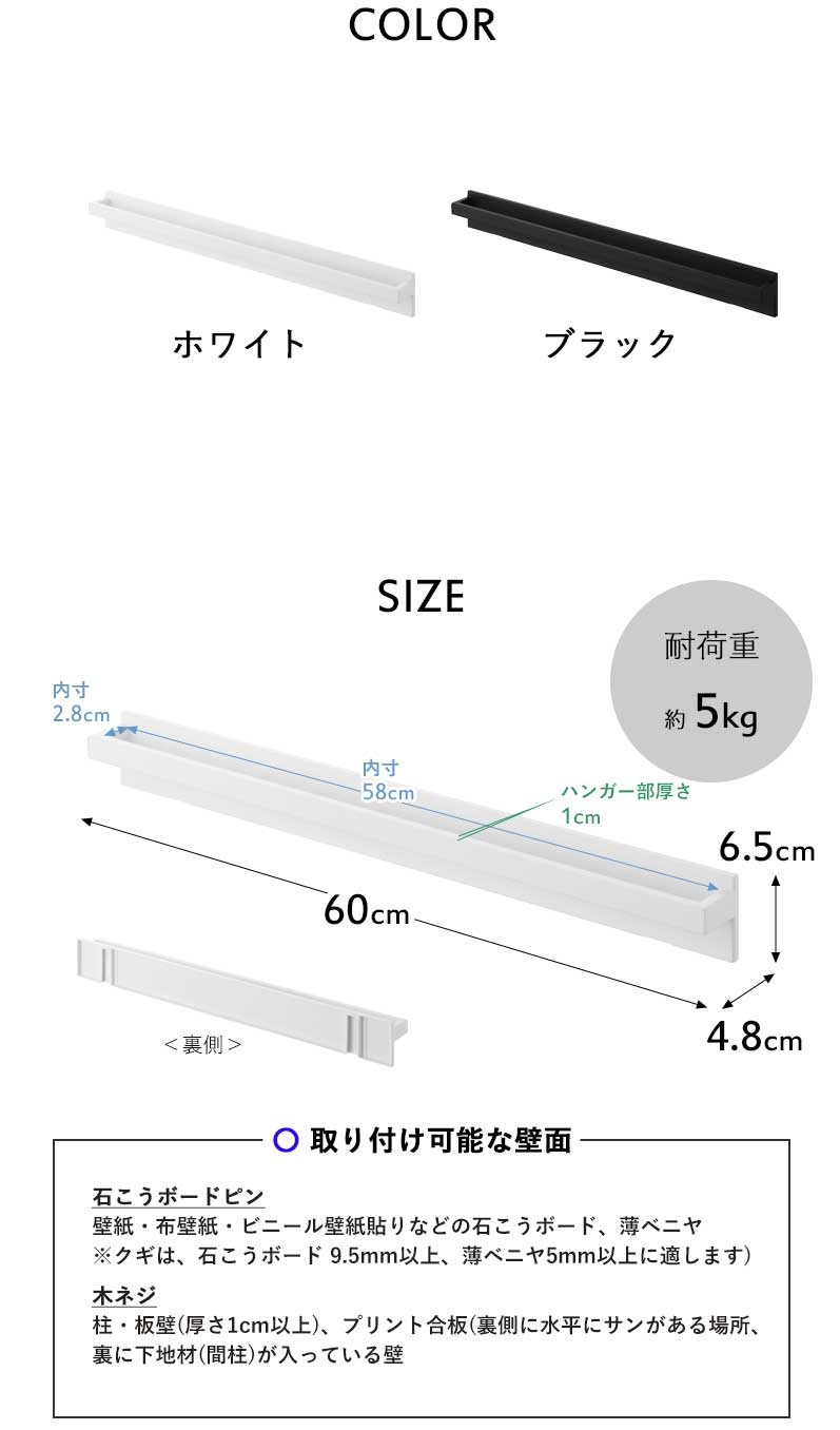 | 備 考 | <取り付けについて> 石こうボードピン 壁紙・布壁紙・ビニール壁紙貼りなどの石こうボード、薄ベニヤ 木ネジ 柱・板壁(厚さ1cm以上)・プリント合板(裏側に水平にサンがある場所)・裏に下地材(間柱)が入っている壁 |