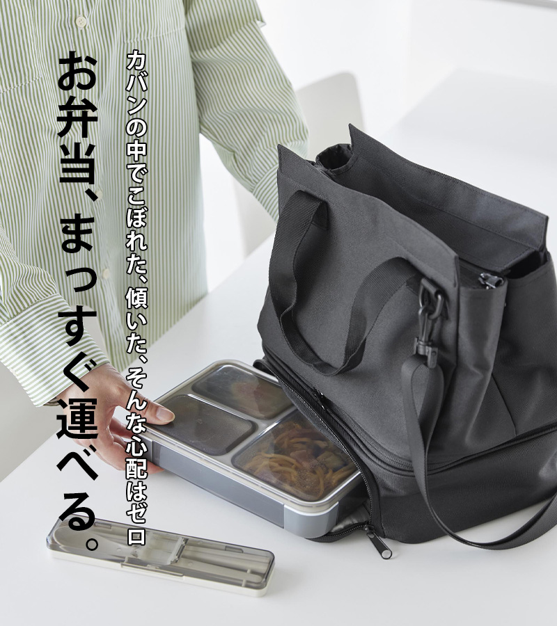 通勤バッグにお弁当を入れて持ち運ぶと、汁漏れや傾きで中身が崩れてしまう…そんな“あるある”をスマートに解決してくれるランチバッグ。