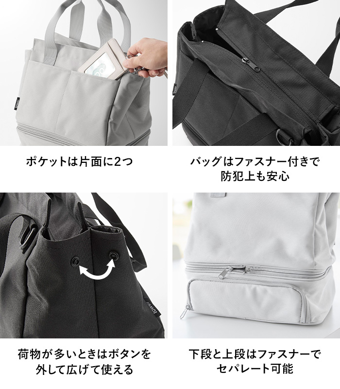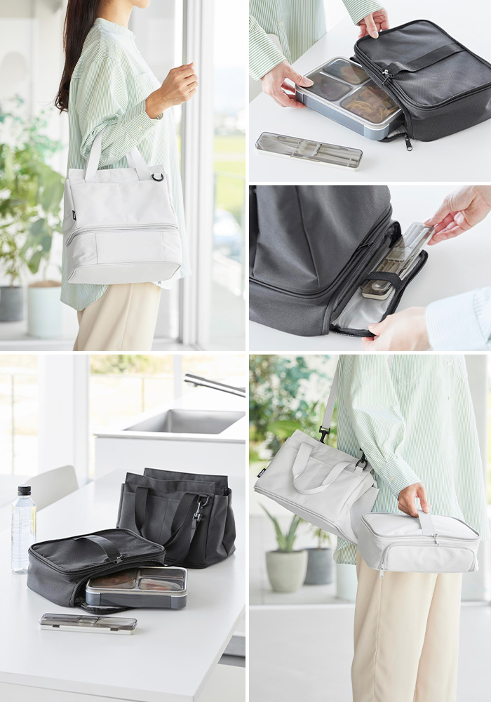 さらに上段と下段がファスナーでセパレートでき、下段にはお弁当を安定して収納、上段は普段使いのバッグとして活躍します。お弁当と持ち物を分けて収納できるので、万が一のときも安心。