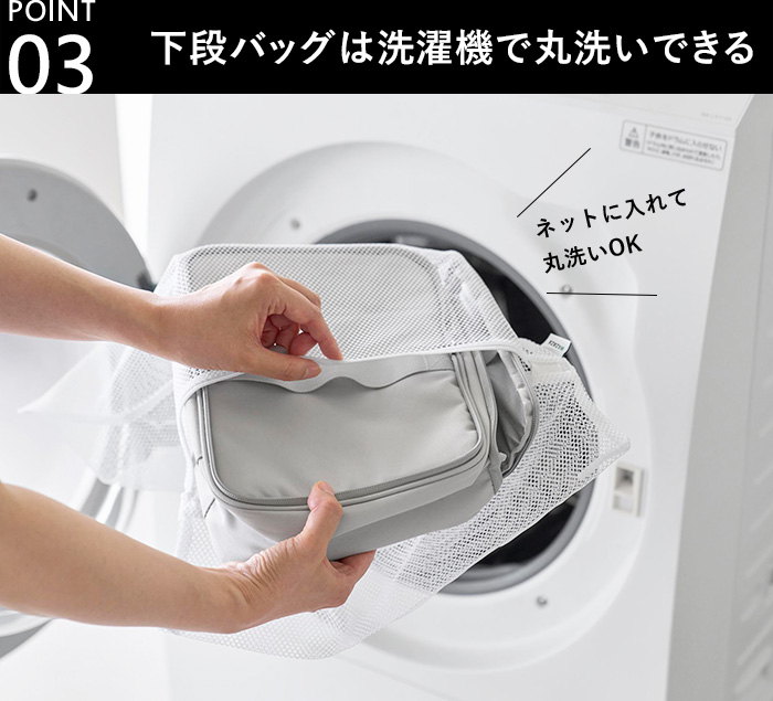 下段はファスナーで取り外したあと、ネットに入れて洗濯機で丸洗いできるので、いつでも清潔に保てます。毎日使うものだからこそ、気持ちよく使い続けられます。
