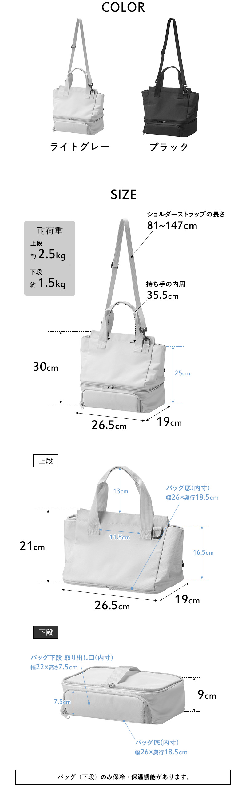下段には保温・保冷機能を備えており、保冷剤と一緒に入れておけば夏場の持ち運びも心配ありません。下段は洗濯機で丸洗いでき、お手入れも簡単。