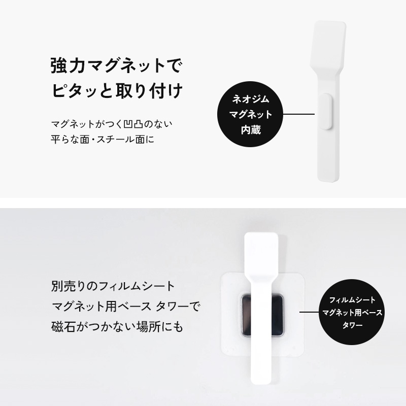 近くにマグネットが付く面がない場合でも、別売りの「フィルムシートマグネット用ベース タワー」を壁面に貼り付けることで"マグネットが付く場所"にすることができます。