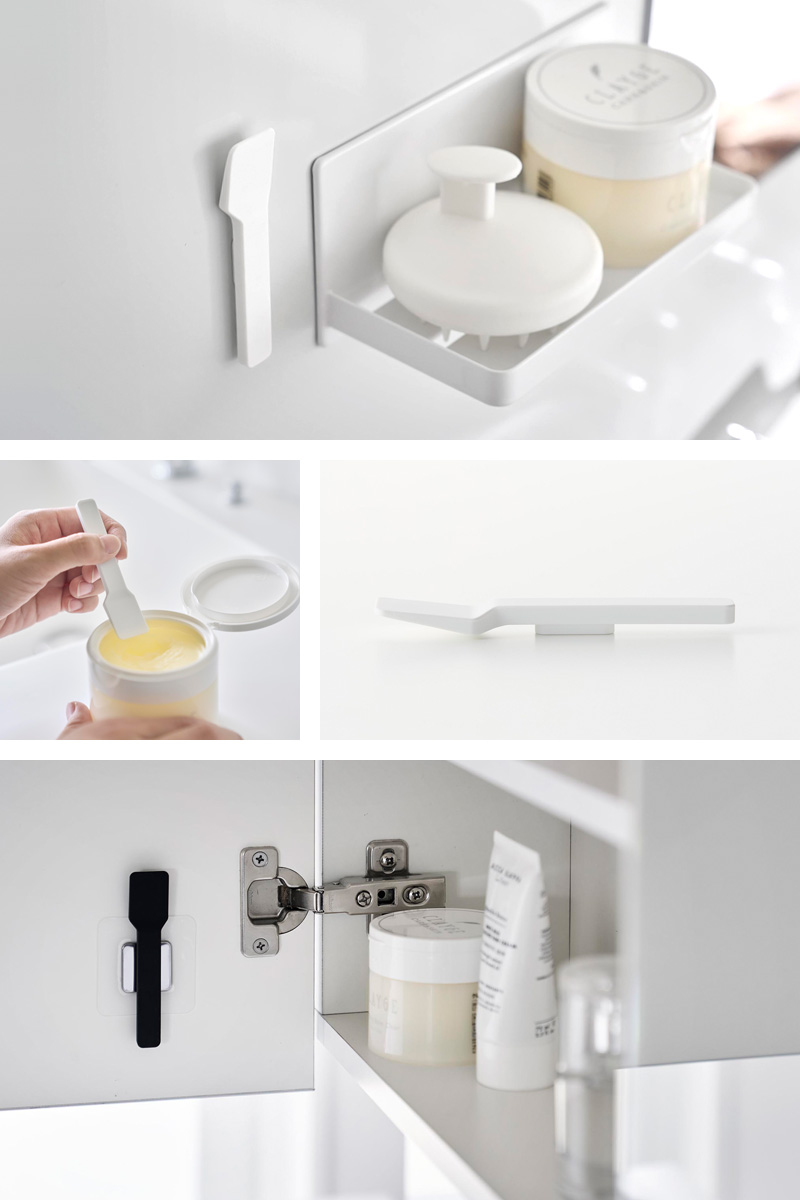 美容クリームやバームをすくい取るときに使用するスパチュラ。小さいから使った後どこに収納するか悩みがちなこのアイテムに、磁石で壁面に浮かせて収納できるマグネット内蔵タイプが登場。