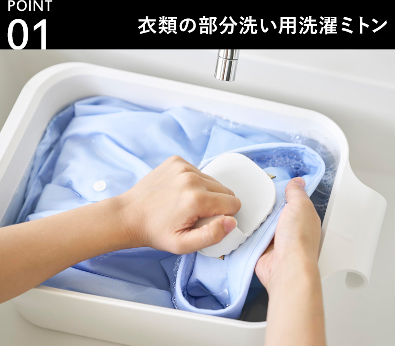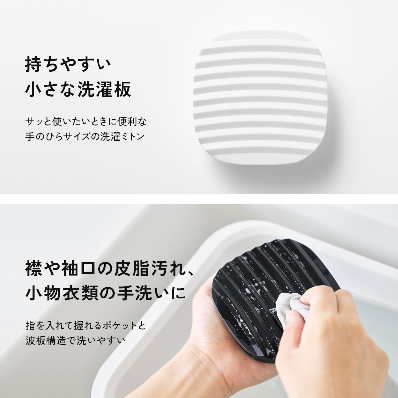 衣類の部分汚れをさっと洗えるコンパクトな洗濯ミトンです。ゆるくカーブのついた波状の洗濯板部分と掴めるポケットにより、襟や袖口についた皮脂汚れや小物衣類の汚れを浮かすつけ置きをしたまま汚れた箇所を重点的かつスムーズに手洗いできます。