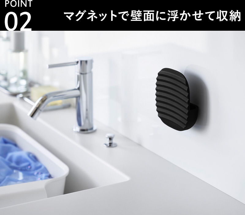 マグネットのつく壁面やスチール面に浮かせて省スペースに収納できます。使用後にしっかり乾かして片付ける等の手間もかからず、ランドリーでサッと使ってパッと収納できる快適な仕様になっています。