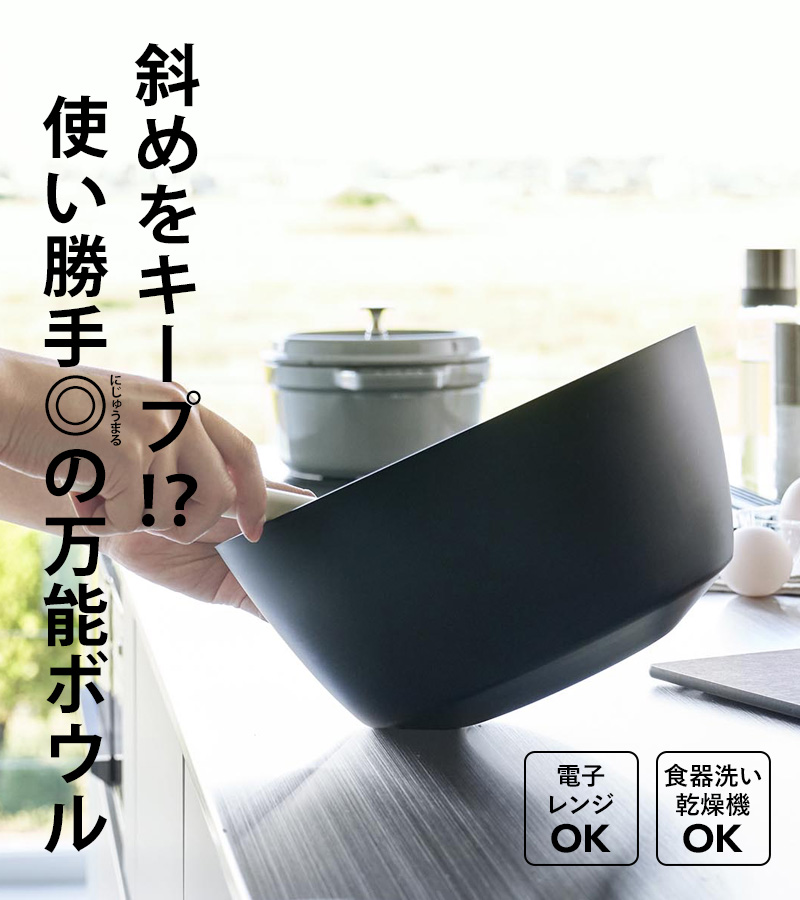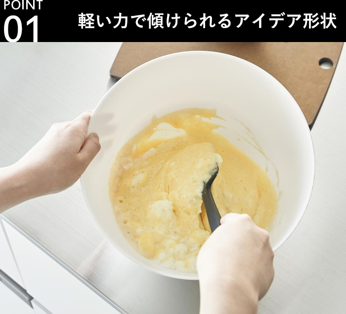 その名の通り、斜めに傾けると安定し混ぜやすい調理ボウルです。よくある曲線のボウルとは異なり、ボウルを傾けた際に斜めをキープするアイデア構造で手首にかかる負担を軽減。軽く手で持つだけで泡立てや混ぜ合わせを楽に行えます。