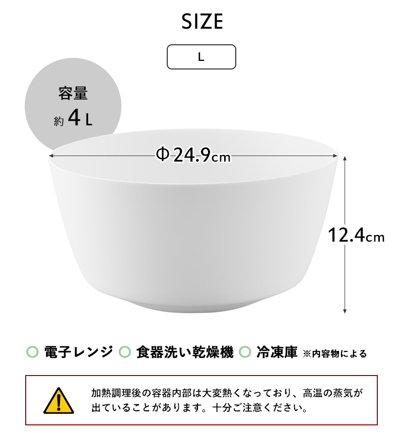 シンプルでスタイリッシュなデザインなので、器としてそのまま食卓に出すことも。洗い物を減らすことができ時短にも繋がる万能ボウルです。食器洗い乾燥機にも対応しています。