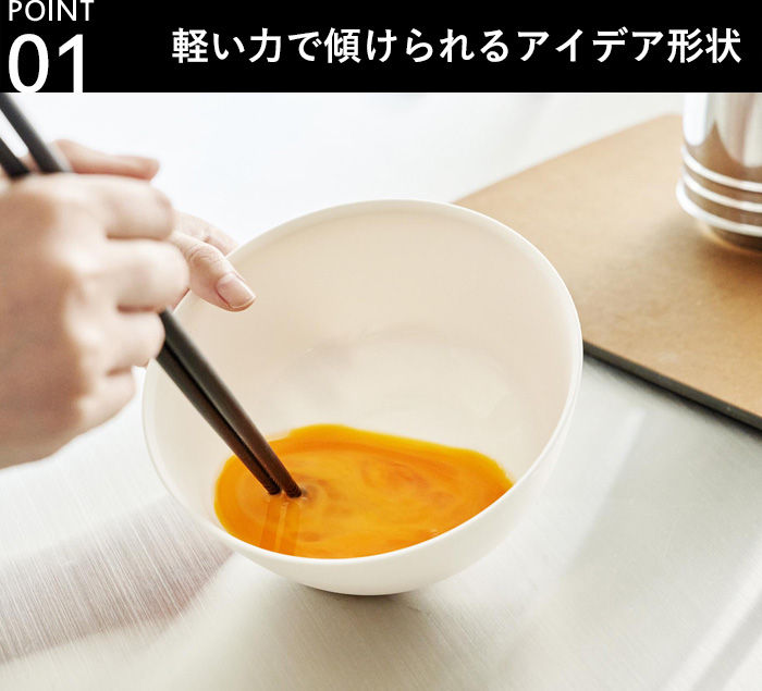 その名の通り、斜めに傾けると安定し混ぜやすい調理ボウルです。よくある曲線のボウルとは異なり、ボウルを傾けた際に斜めをキープするアイデア構造で手首にかかる負担を軽減。軽く手で持つだけで泡立てや混ぜ合わせを楽に行えます。