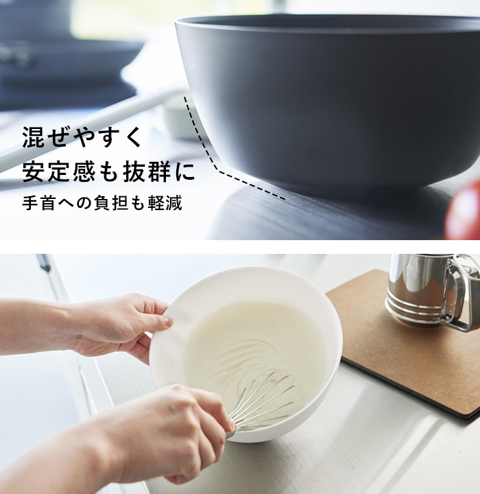 その特長は、底面の傾斜構造。傾けた際に、斜めをキープしてくれるので軽く手で持つだけでしっかりと食材を混ぜ合わせることができます。