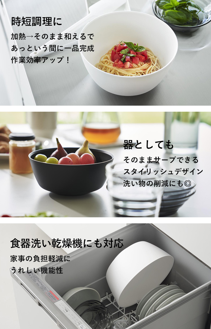 シンプルでスタイリッシュなデザインなので、器としてそのまま食卓に出すことも。洗い物を減らすことができ時短にも繋がる万能ボウルです。食器洗い乾燥機にも対応しています。