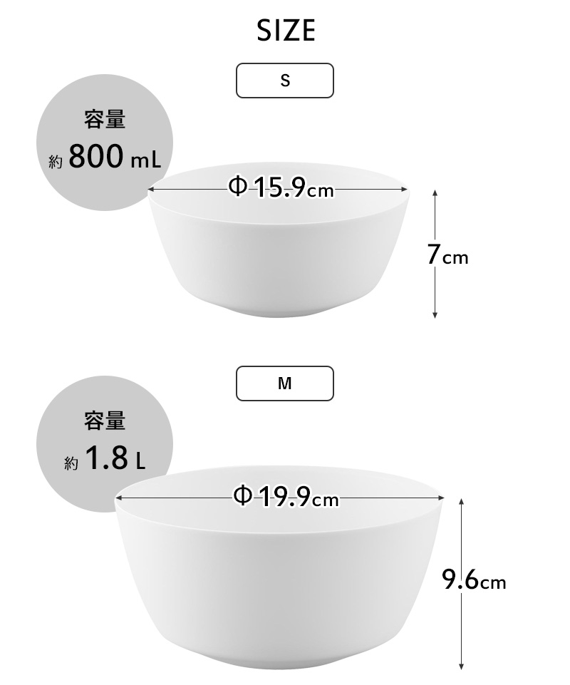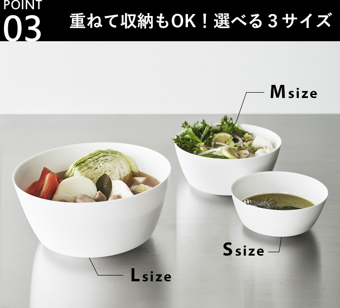 調理ボウルシリーズには、使いたいシーンに合わせて選べる3サイズございます。調味料の混ぜ合わせなど、ちょっとした作業に使うならSサイズ。野菜やフルーツを洗ったり、サラダの混ぜ合わせ、お菓子づくりにもひとつは用意しておきたいMサイズ。家族が多いご家庭やたっぷり調理にはLサイズがおすすめです。