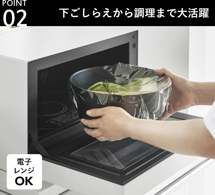 さらに嬉しい電子レンジ対応。野菜やフルーツを洗うのはもちろん、食材の加熱調理にも活躍してくれます。ボウルひとつで完結できるから、下ごしらえがぐんっとスムーズになり洗い物の削減にも。