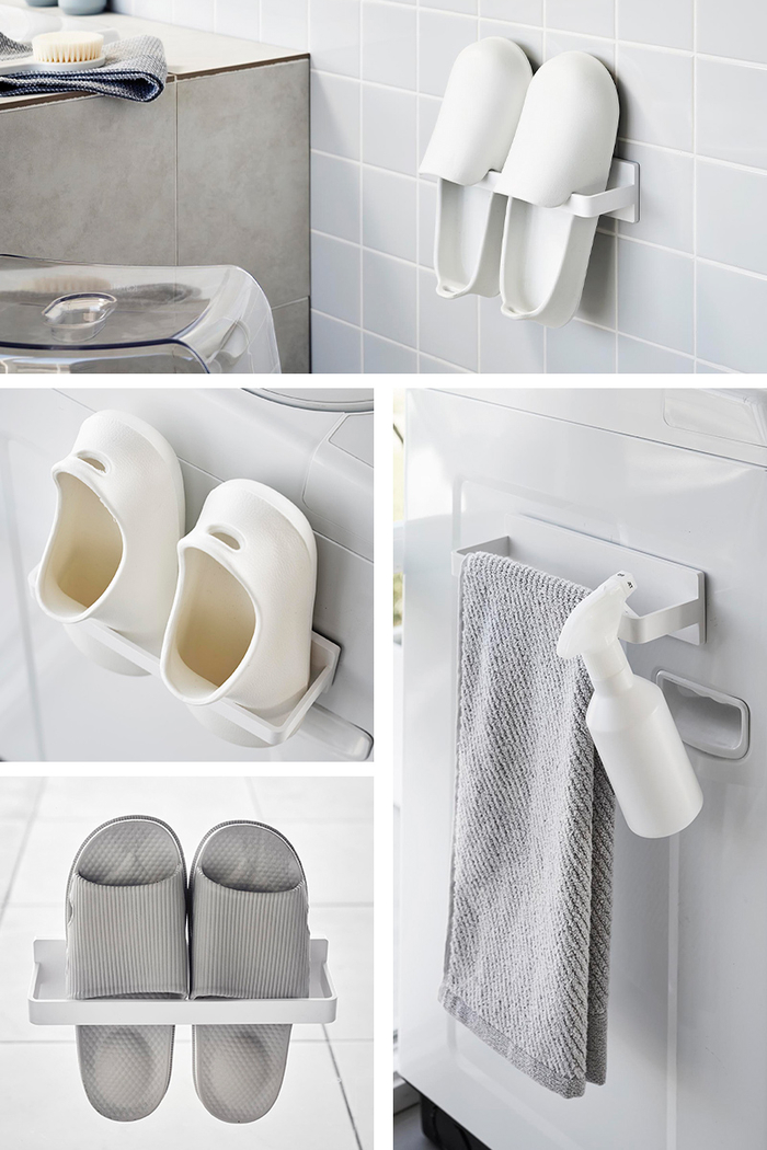 洗濯機横などに貼り付けるだけ。フィルムフックで好きな位置に簡単設置できます。