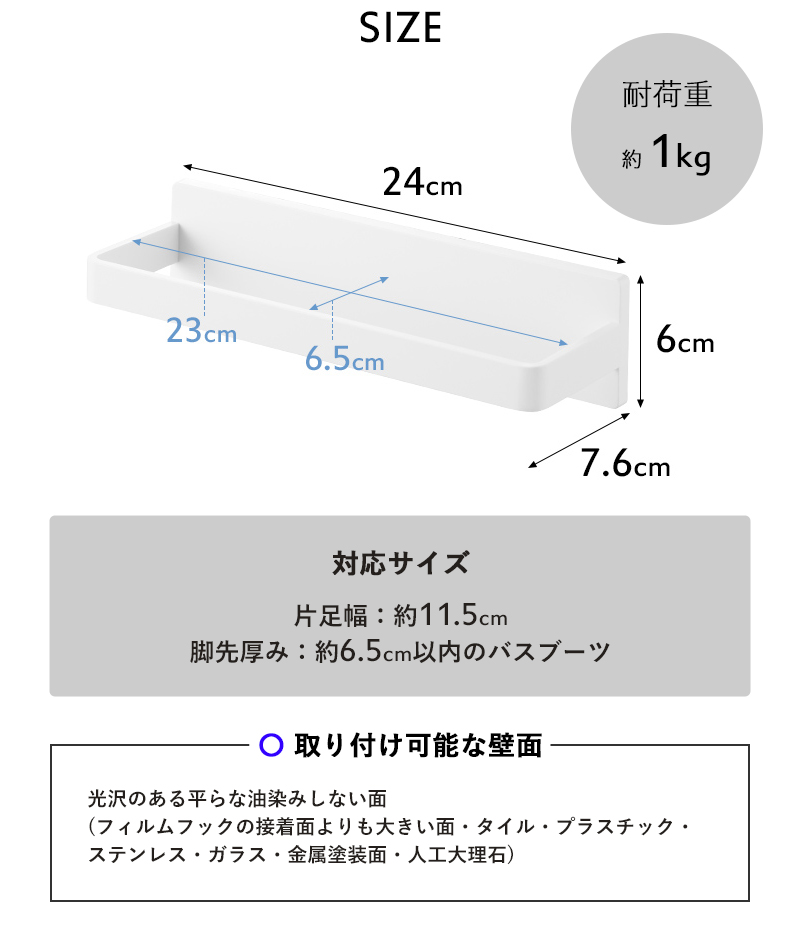 | 備 考 | <対応サイズ> 片足幅 約 11.5cm × 脚先厚み 約 6.5cm以内のバスブーツ <取り付け可能な壁面> 光沢のある平らな油染みしない面(フィルムフックの接着面よりも大きい面・タイル・プラスチック・ステンレス・ガラス・金属塗装面・人工大理石) |