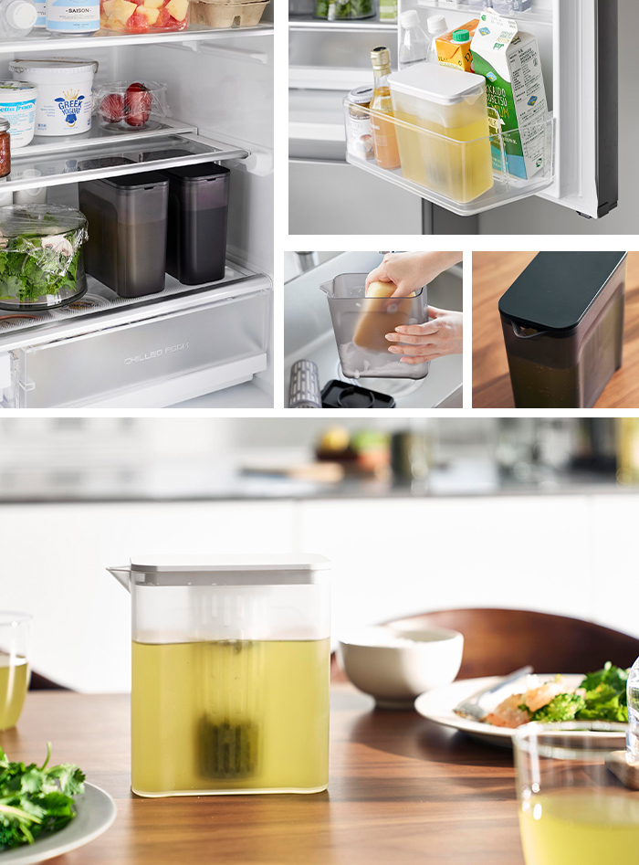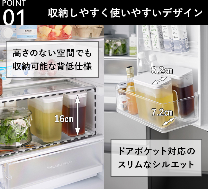 ローハイト設計&スリムな形状で、高さ制限のある冷蔵庫の下段やドアポケットにもスッキリと収納可能です。状況に応じて自由に収納場所を選べる無駄のないデザインで、限られたスペースを効率よく活用できる実用性と美しさを兼ね備えたデザインが特徴です。
