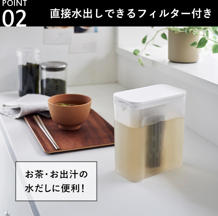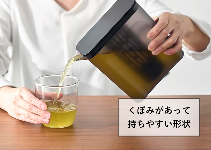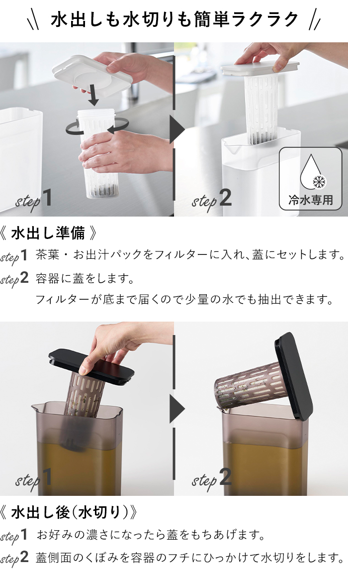 冷水筒内のメッシュ製のフィルター(ティーバッグ入れ)に茶葉をそのまま入れて水出ししていただけます。水出しした後は、蓋側面のくぼみを容器の縁に引っ掛けるだけで、簡単にフィルターの水切りが可能です。
