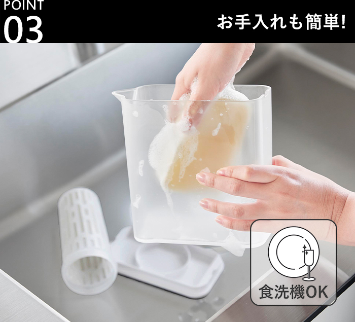 お手入れの際には蓋・フィルター・容器本体をパーツごとに分けてしっかり洗浄していただけます。食洗機対応でお手入れが簡単なのも嬉しいポイントです。