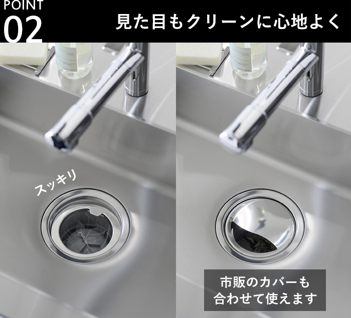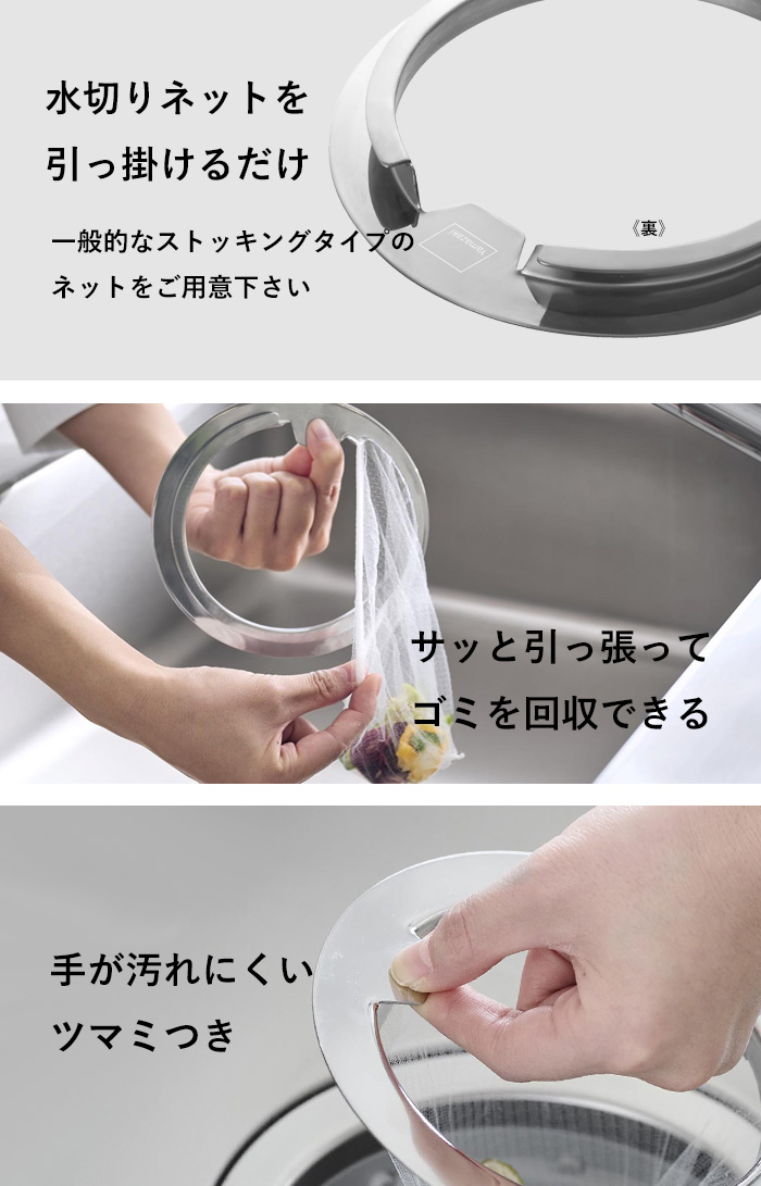 ※水切りネットのサイズや形状・伸縮性などによっては本体とネットの間に隙間が生じることがあり、ゴミが抜けてしまう場合もございます。隙間なく取り付けられていることを確認の上ご使用ください。