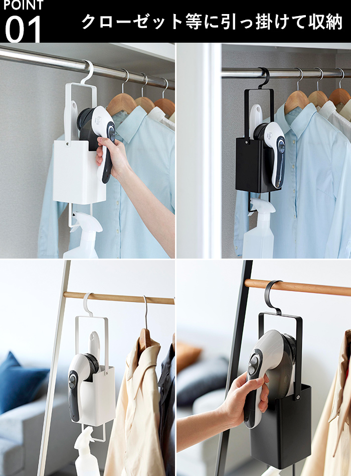 引っ掛けるだけのお手軽設置で、置き場所に困りがちな毛玉取りや、使用頻度の高い衣類ケア用品の定位置づくりに一役買ってくれる便利なホルダーです。