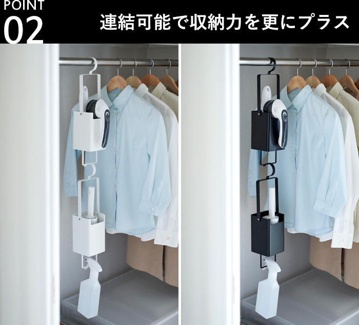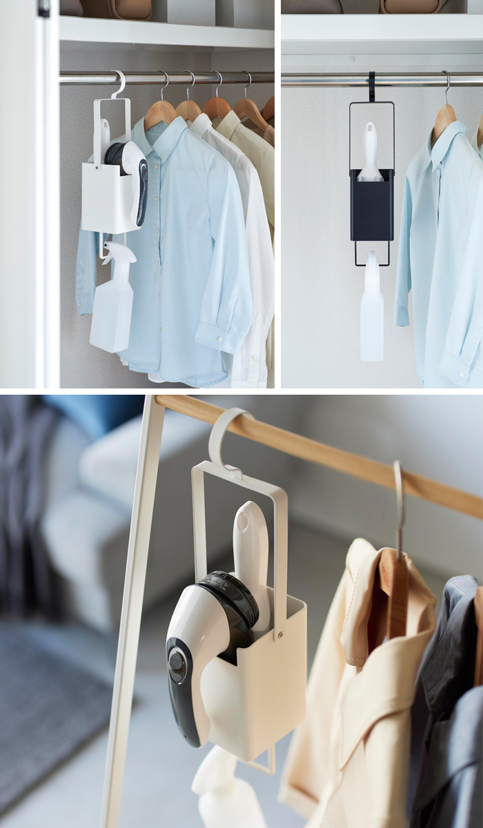 クローゼットやコートハンガーのパイプに引っ掛けて洋服のそばに収納できるので、使いたい時にサッと使うことができます。