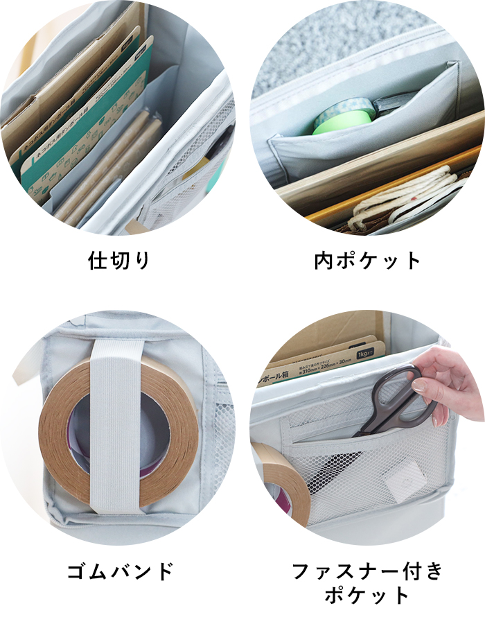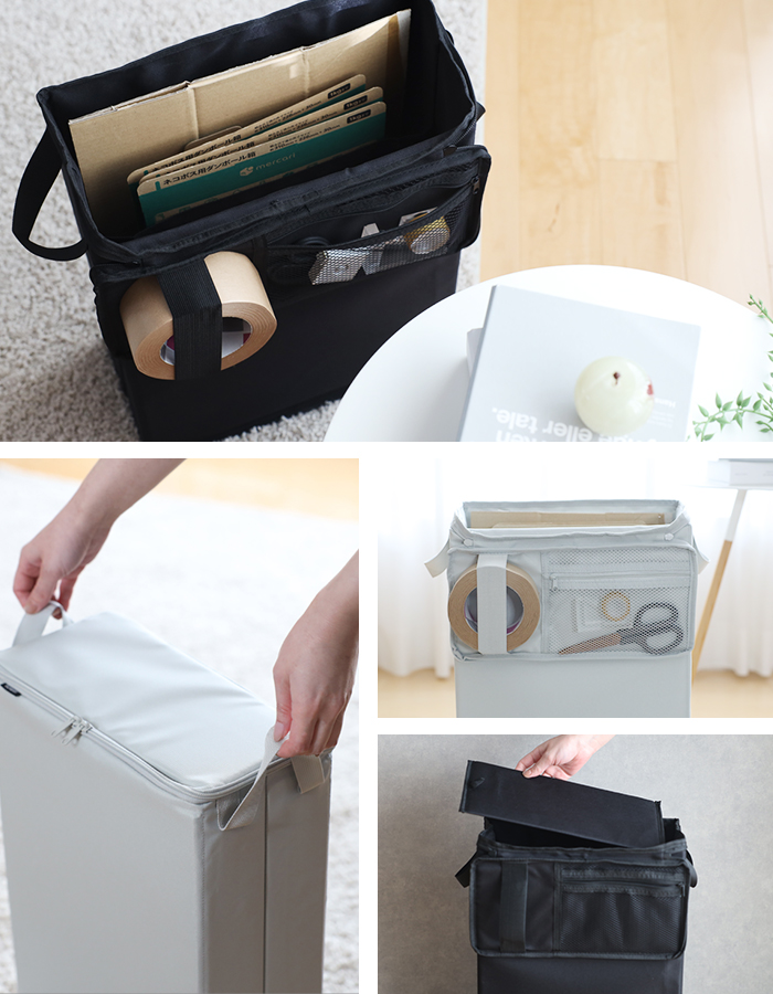 段ボールや紙袋などの大きなものは仕切りの付いたボックスの中へ。内ポケットも付いているのでマスキングテープなどの小物を入れるのに役立ちます。