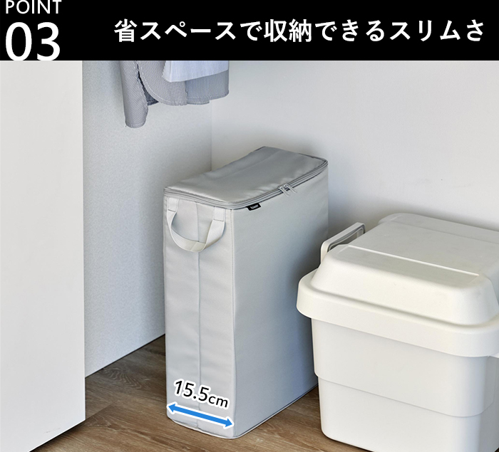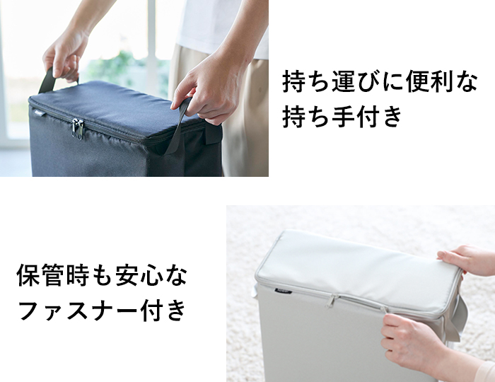 横幅約15.5cmのスリムサイズでクローゼットの隙間などに省スペースで置くことができます。シンプルなデザインなのでお部屋の隅に置いても目立たず、持ち手付きで持ち運びも楽々。蓋はファスナー付きなので保管中でもほこりが入らず安心。不意に倒してしまっても中身が飛び出る心配もありません。