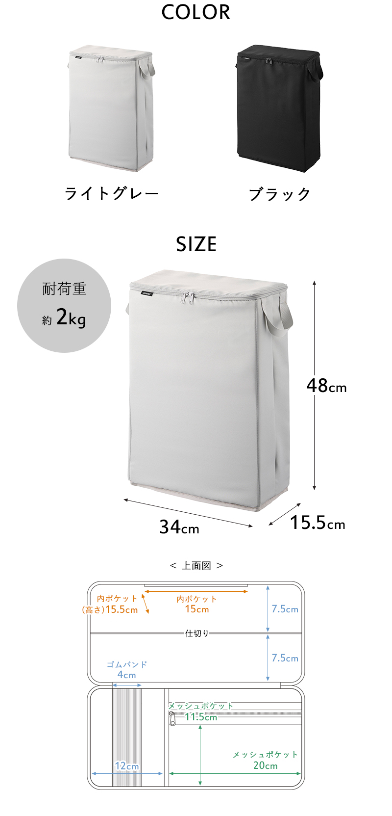 | サイズ | 約 幅34 × 奥行き15.5 × 高さ48cm(持ち手含まず) [内寸] メッシュポケット:約 幅20 × 高さ11.5cm 内ポケット:約 幅15 × 高さ15.5cm ゴムバンド:約 幅4cm |