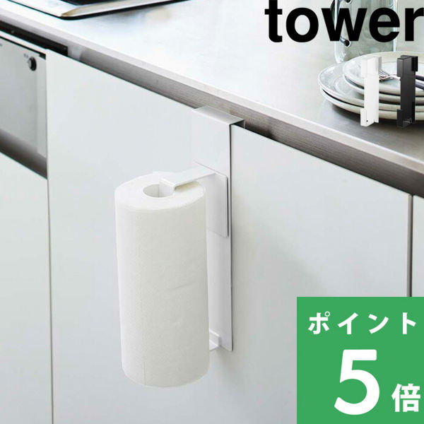 シンクやキッチンカウンターの扉に引っ掛けるだけの簡単な取り付けで、いつも使うキッチンペーパーを片付けることができます。タワーらしいシンプルなデザインなので圧迫感もありません。