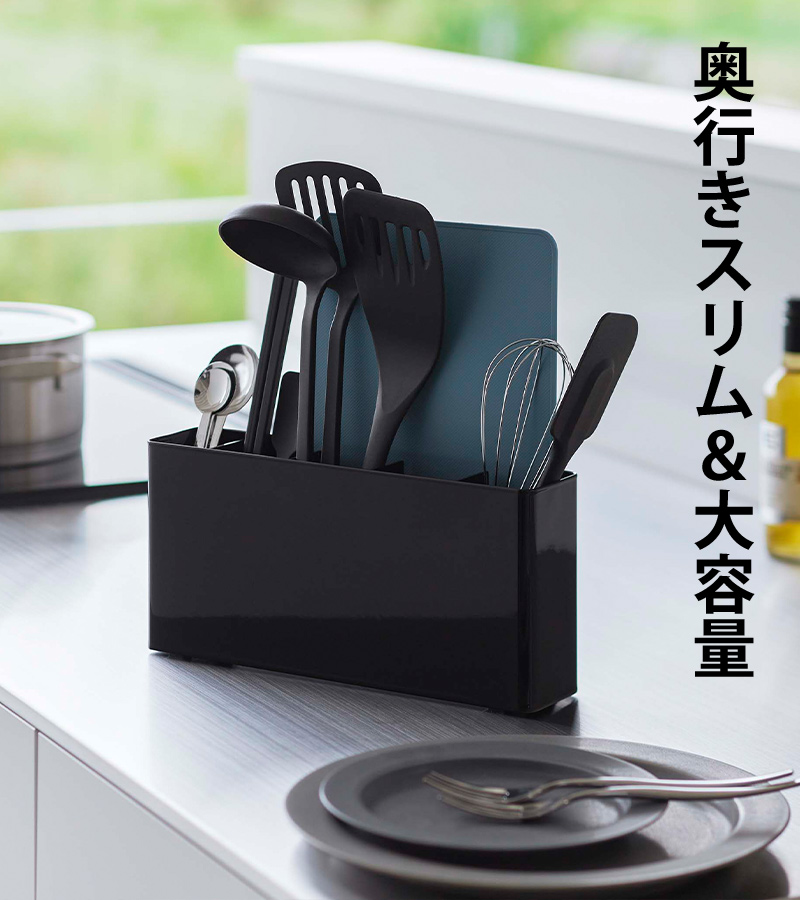 キッチンツールとシートまな板を一緒に収納できる大容量タイプのツールスタンド。仕切り板奥の隙間にシートまな板を立てて収納でき、シートまな板が一目で見つかるため、料理の効率が格段にアップ。手前には、菜箸、お玉、フライ返し、ヘラなどの収納に便利です。