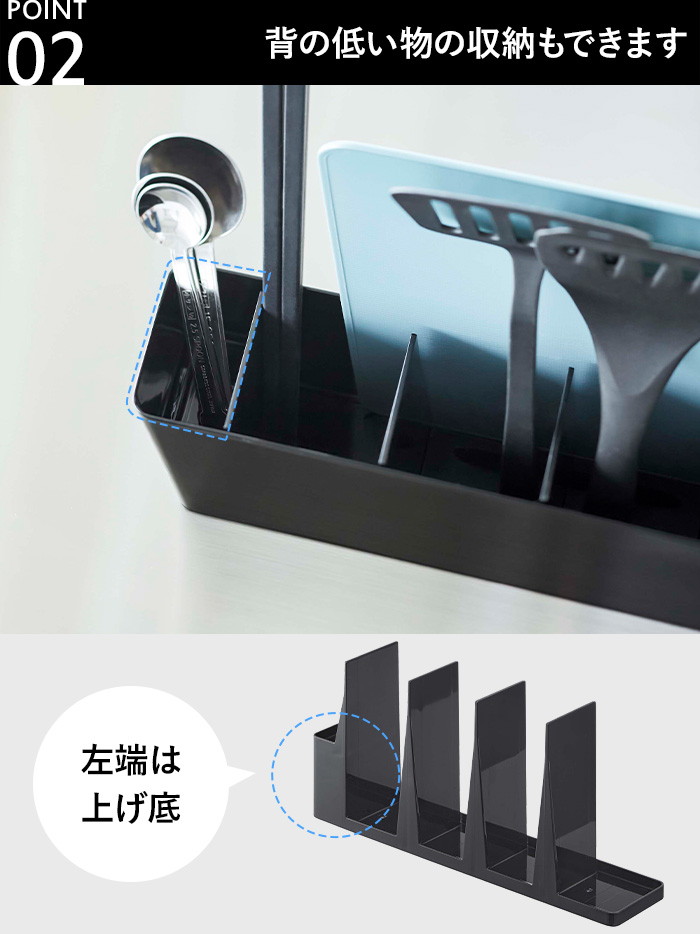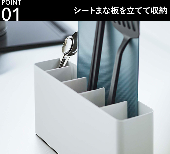 仕切りの右側3枚は奥側に隙間があり、そちらにシートまな板を収納できる構造になっています。仕切りで5つのスペースに分けられているため、キッチンツールがごちゃつきがちな場合でも、簡単に立てて入れることができます。もちろん、シートまな板をお使いでない場合でも、調理器具の収納に活用できるスタンドです。