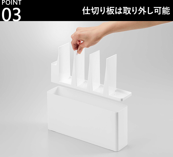 キッチンに置くスタンドなので、お手入れが簡単なのもおすすめポイントです。こちらの仕切り板は取り外し可能です。しかも、樹脂製なので、丸洗いもOKです。手軽に洗えて、衛生的に保つことができます。
