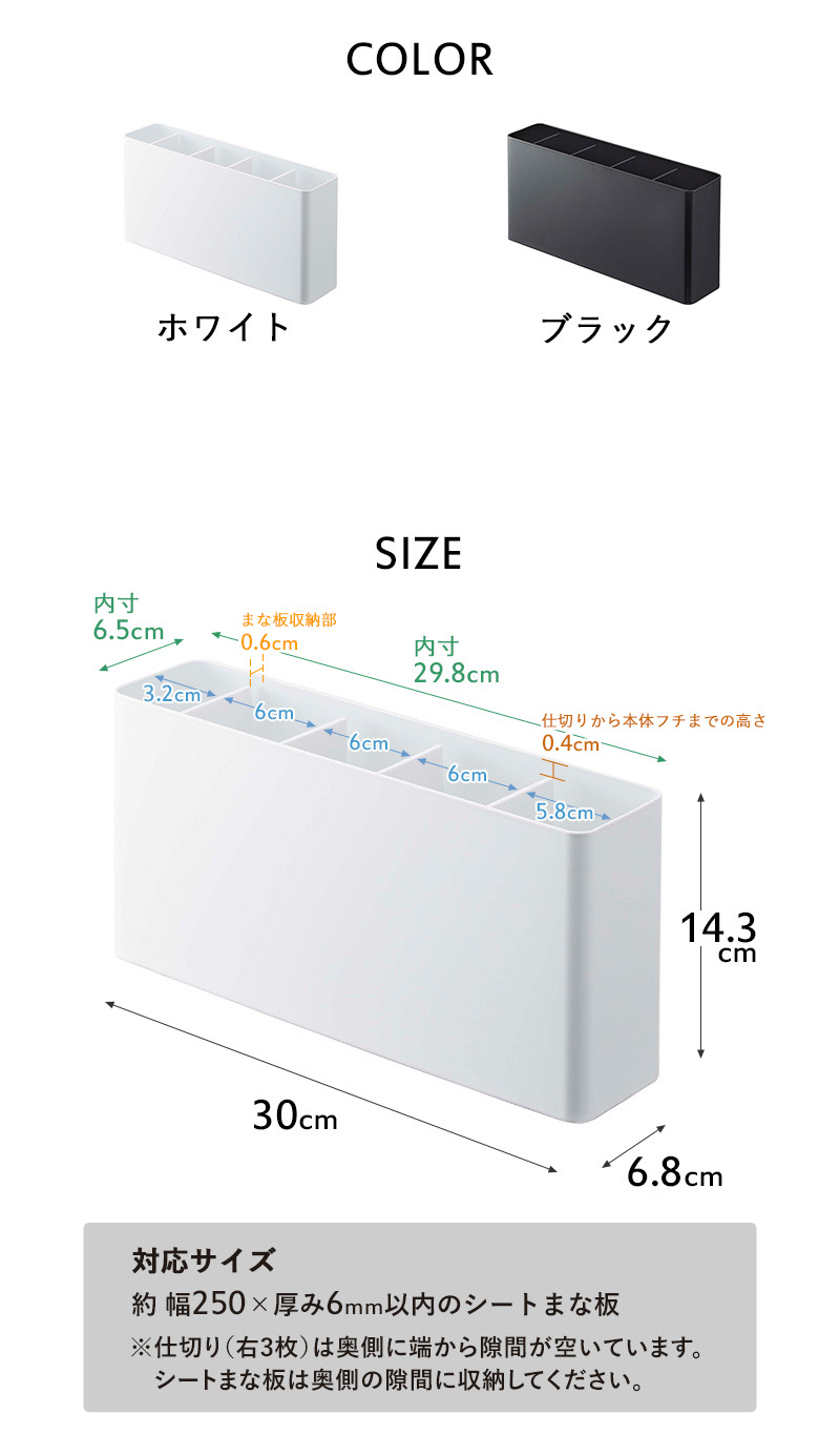 | 備 考 | <対応サイズ> 約 幅250×厚み6mm以内のシートまな板 ※仕切り(右3枚)は奥側に端から隙間が空いています。シートまな板は奥側の隙間に収納してください。 |