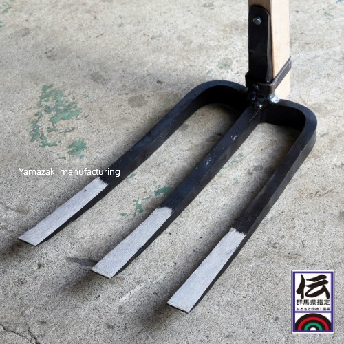 三本 備中鍬 (馬蹄型) 樫柄付 鍬 山崎製作所 粘土質や特に固い土質に