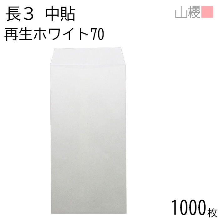 [ケース販売] 山櫻 封筒 長3 中貼 ホワイトR40CoC 紙厚70g 〒枠ナシ 1,000枚 / A4三折用 再生 白 無地 郵便番号枠なし 00509033-1000