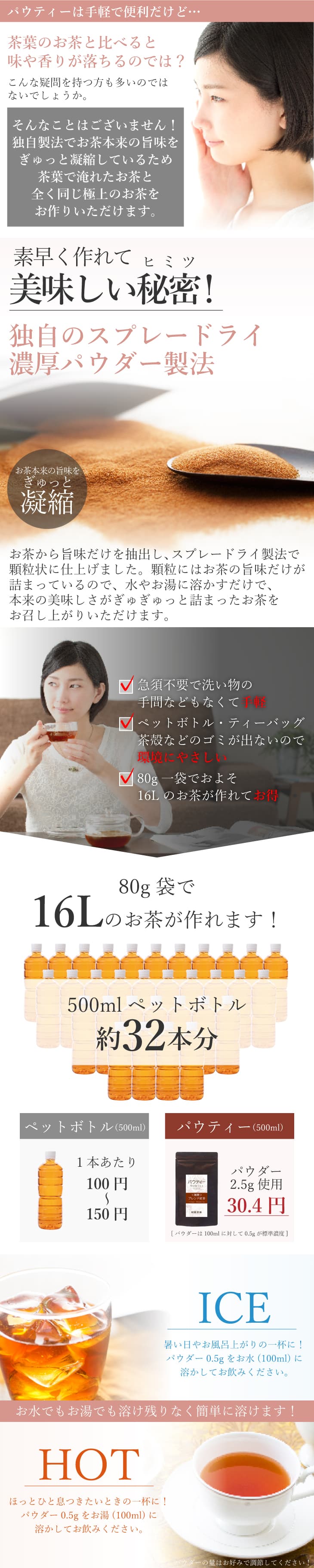 | 内容量 | 1袋 80g 1杯(100ml)あたりパウダー0.5g使用で約160杯分 |