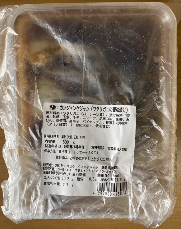 ■原材料 ワタリガニ(バーレーン等)油、砂糖、玉葱、ネギ、ニンニク、昆布つゆ、生夢、みりん、蒸留酒、唐辛子、パイナップル、椎井] /調味料(アミノ酸等)(一部に大豆小麦を含む)漬け原料[留原料原産地名:国産(大根、玉意、ネギ)