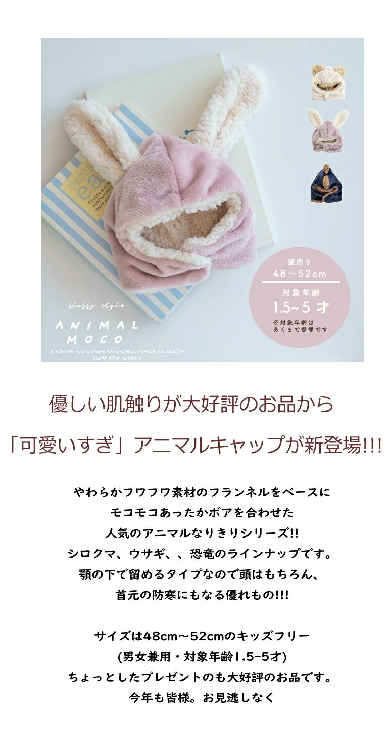 5%off!! アニマル 中ボア あったか 防寒 キャップ (48cm-52cm) キッズ BABY 耳つき フランネル 裏ボア 男女兼用 ニット 帽子 ベビー キッズ うさぎ くま 恐竜