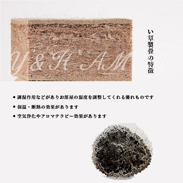 ○天然素材の藺草ならではの懐かしい香りと爽やかな肌触りでリラックス効果が期待でき、また、い草には生活空間の空気を綺麗にしてくれる効果があるとされています。フローリングや壁紙の接着剤に使用されハウスシックの原因となるホルムアルデヒドを吸着してくれる効果があるとされているからです。しかもタバコの煙や暖房機器などから発生する有害な二酸化窒素に対しても高い吸着効果を持つと言われています。