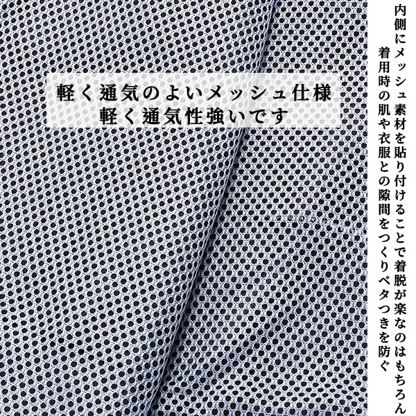 ○左右ポケット付き、ムレやベタ付を抑えるため総裏メッシュで仕上げました。