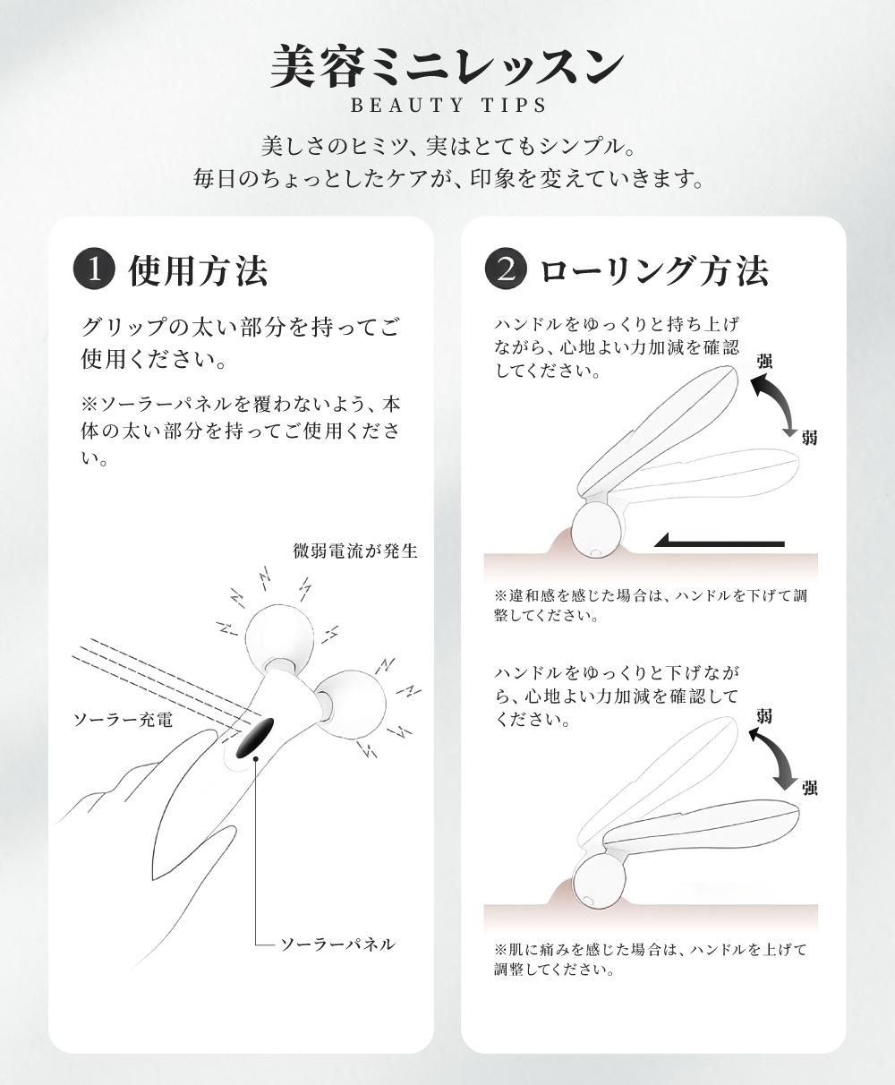 美容ローラーのハンドルに設計られたソーラーパネルから光を取り込み、微弱電流マイクロカレントを発生させます。電源一切不要、いつでも使用可能です。※マイクロカレントとはきわめて微弱な電流で、ピリピリとした体感はほとんどありません。毎日5分間で、普段のちょっとした時間を利用して、忙しい毎日の中でも、無理なくお手入れを続けることができます。