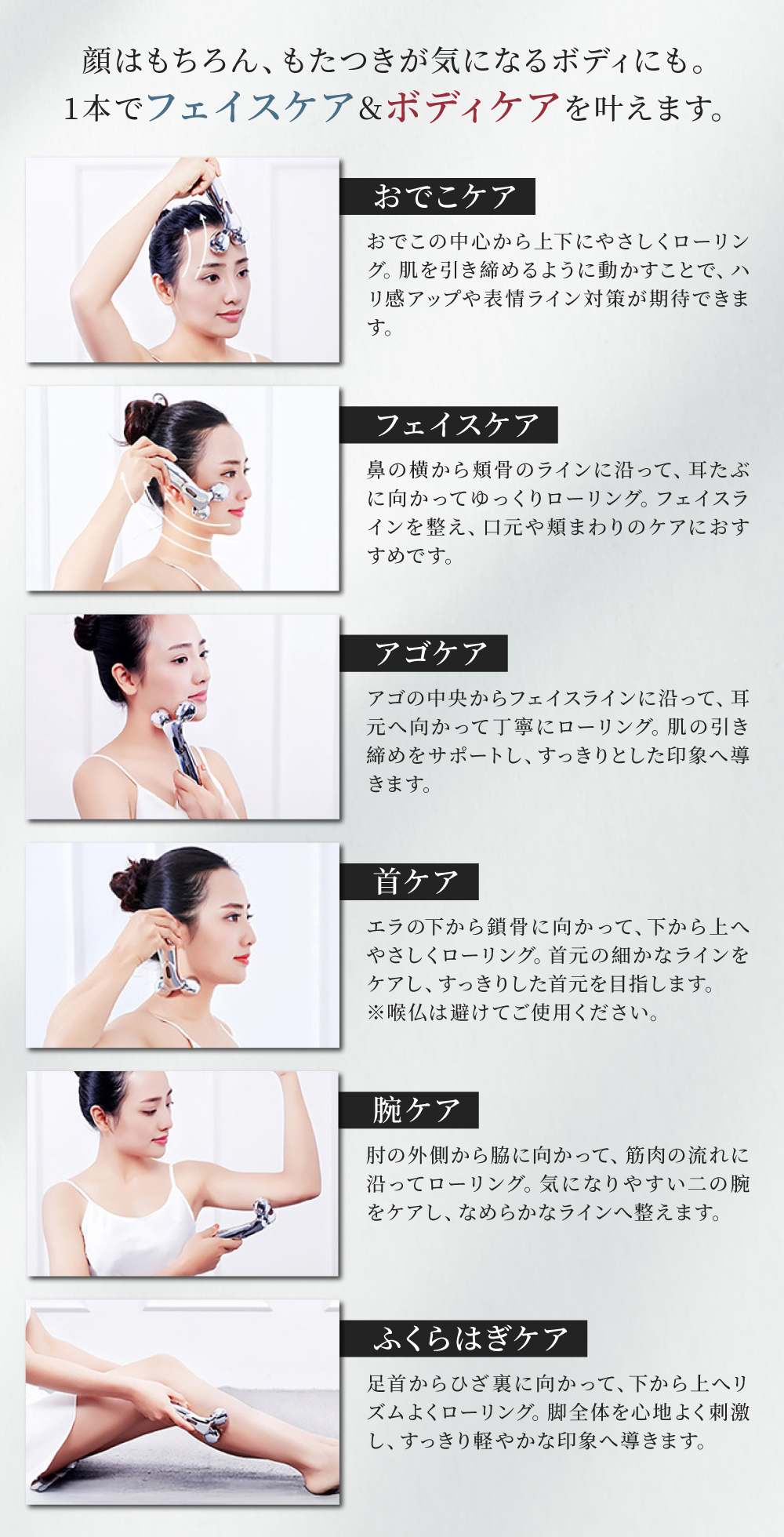 輝く流れをもっと強調させるようなデザインで手にしっくりと馴染む流線型のボディになっています。ダイヤモンドカットの3Dデザイン及び鏡面仕上げされた本体は高級感があって、Y字型ローラーに揉まれる独特な感触が気持ちいい。