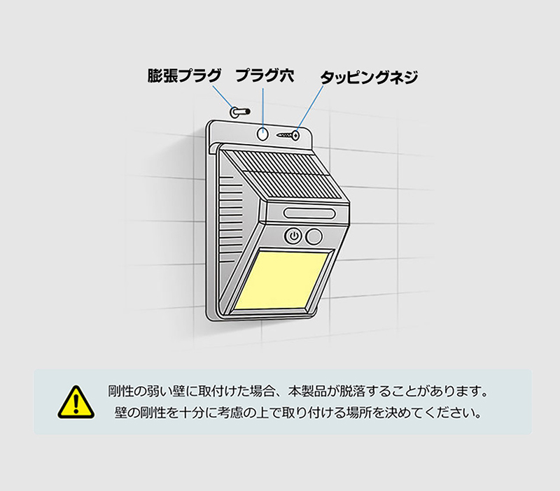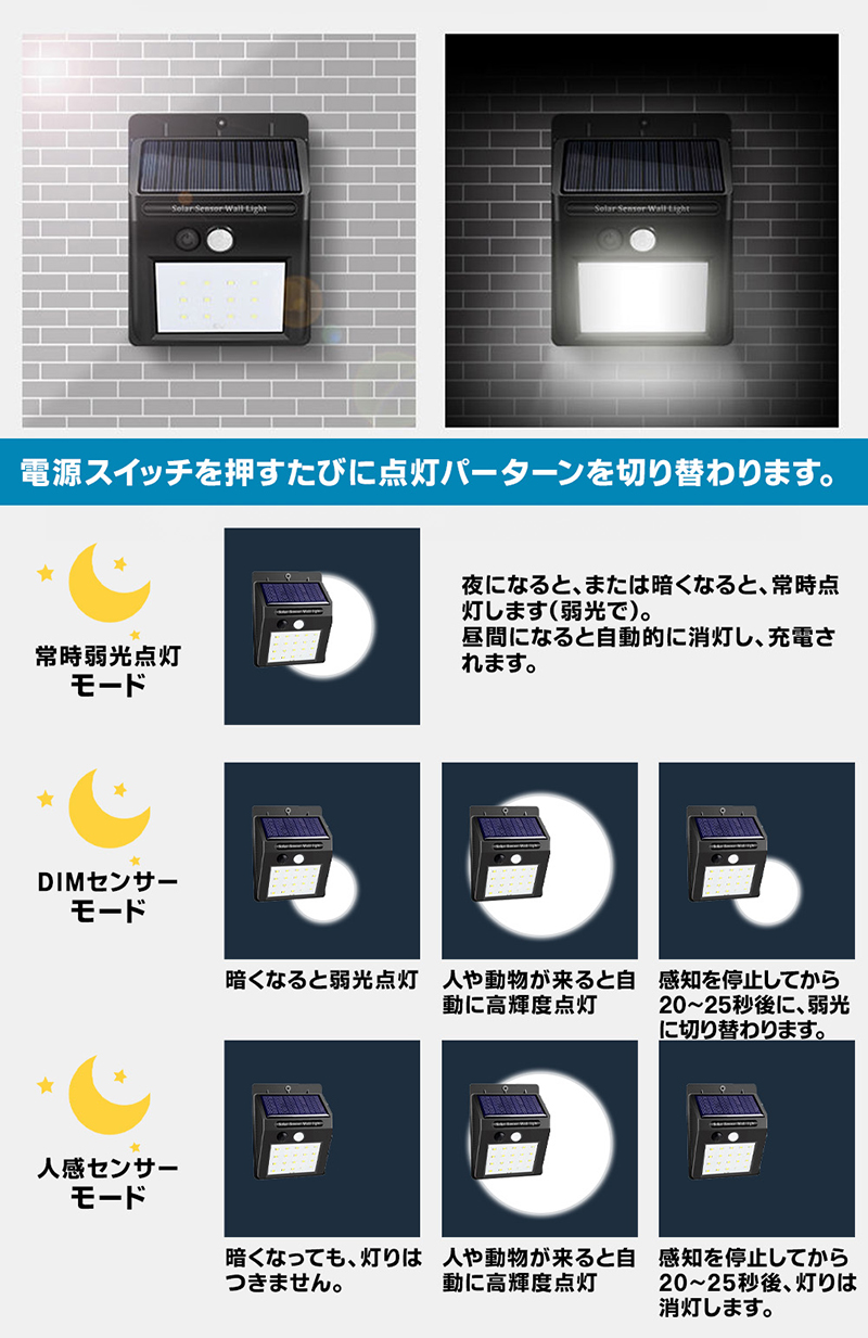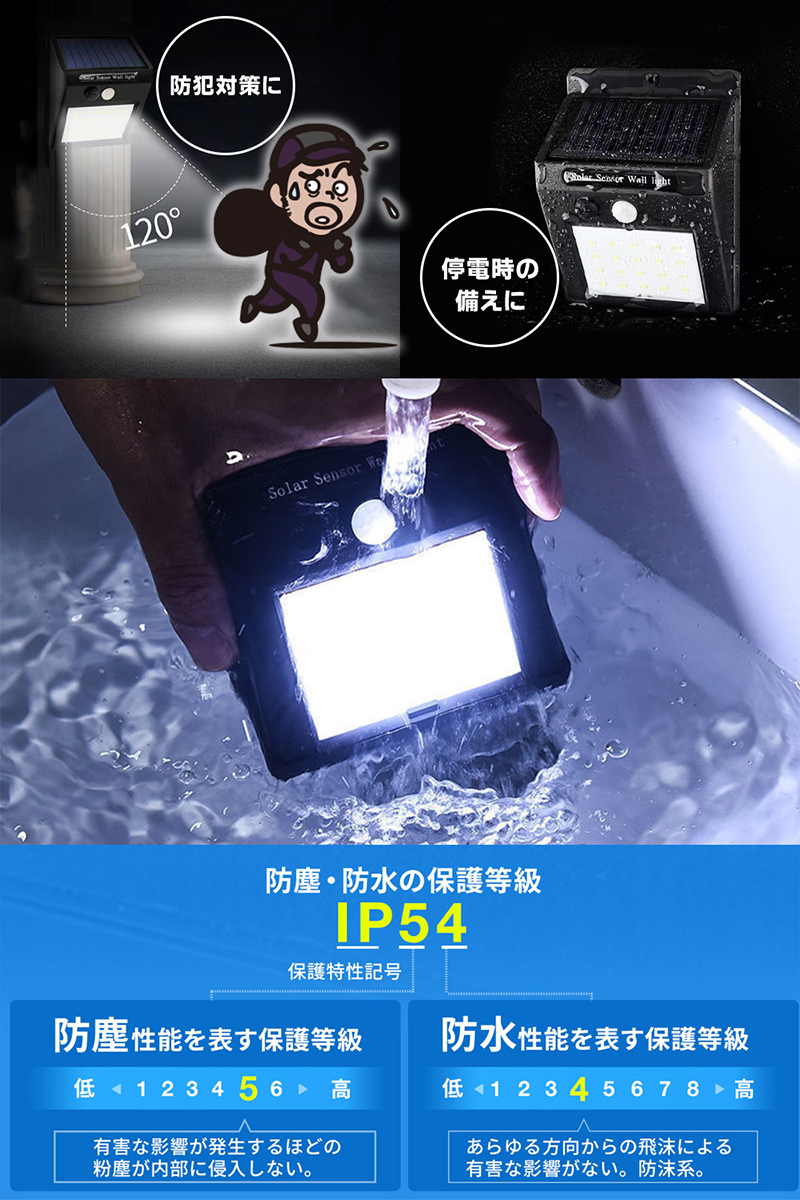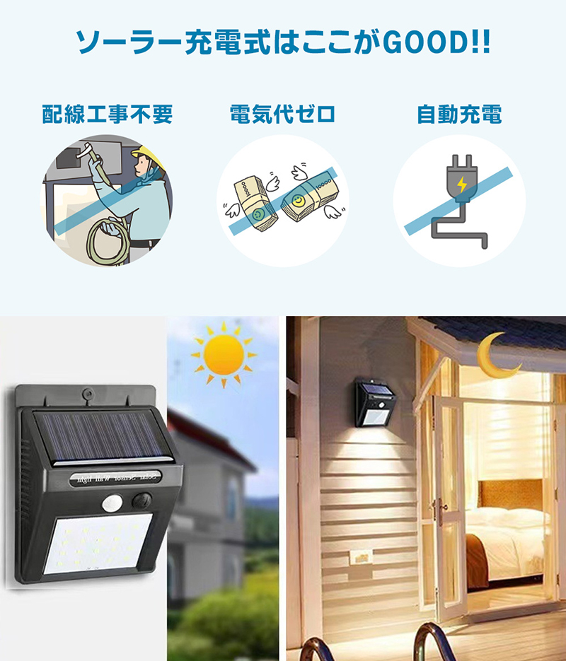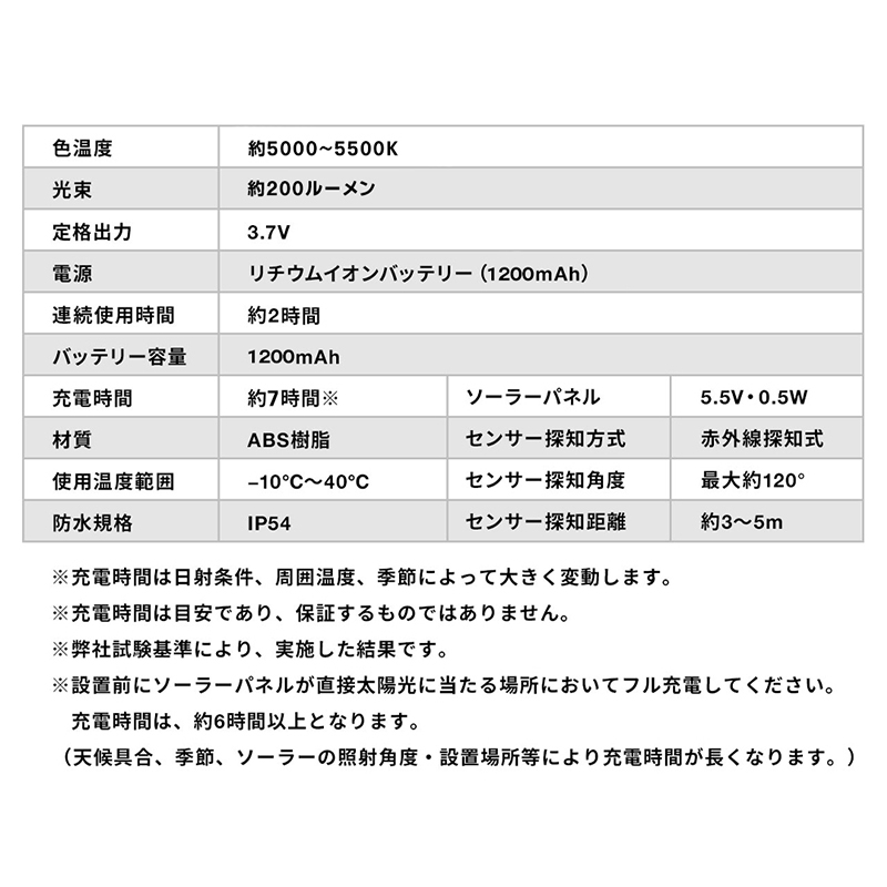 ソーラー充電式の人感センサー付きLEDライト。屋外に設置可能で日中は太陽光で充電。木壁やコンクリート壁にネジ固定可能な防水防塵のIP54対応のライト。暗い所で明暗センサーが働き自動で点灯。人感センサーが感知することでLEDが点灯。LED点灯後、約20秒で自動消灯。最大約200ルーメン。2個セット。