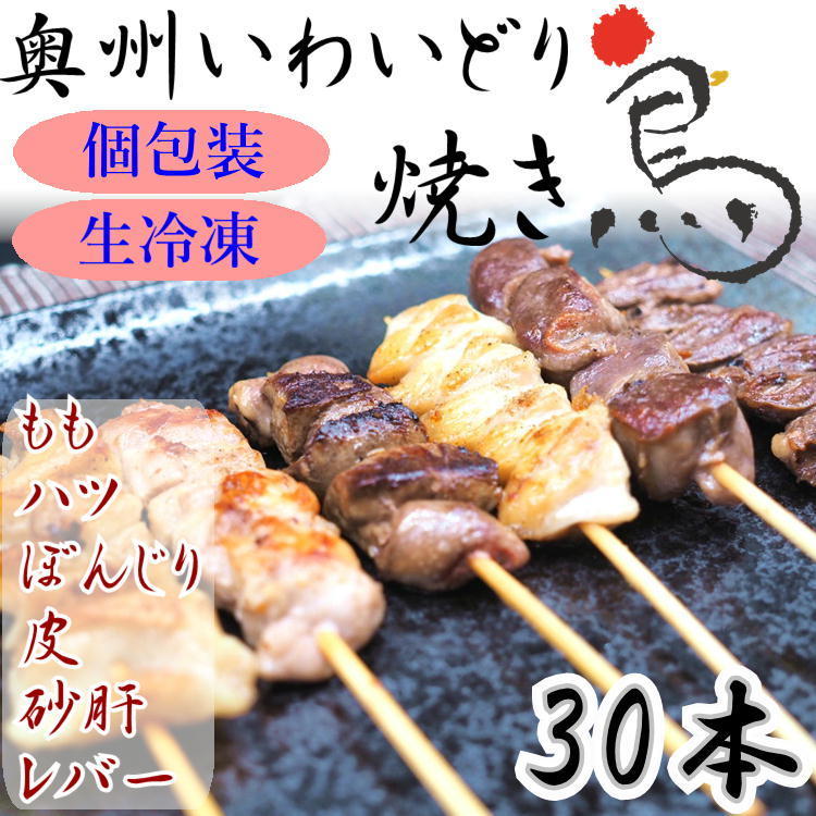 国産 やきとり いわいどり 6種の30本セット 焼き鳥 焼鳥 冷凍 生焼鳥 鶏皮 もも ぼんじり レバー ハツ 砂肝 自宅 居酒屋 つまみ 岩手県 東北 送料無料 鶏 肉