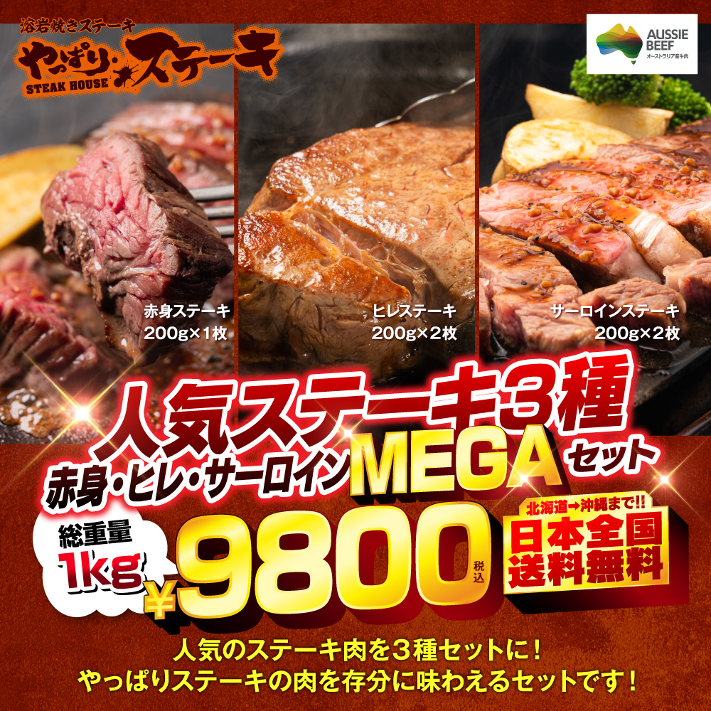 | ●赤身ステーキ 200g×1枚 ●ヒレステーキ 200g×2枚 ●サーロインステーキ 200g×2枚 |
