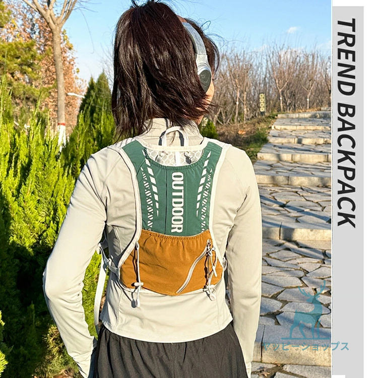ランニングリュックは、軽量でコンパクトなデザインが特徴のバックパックです。1.5Lの給水袋セットがあり、長時間のランニングやサイクリング、ウォーキングに最適です。撥水加工が施されているため、天候を気にせず使用できます。反射テープが付いており、夜間の安全性も確保。男女兼用で、トレイルランニングやジョギングにも対応する多機能なザックです。