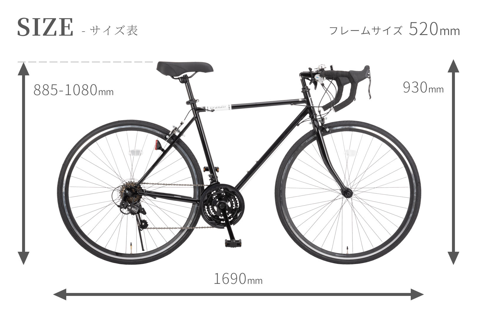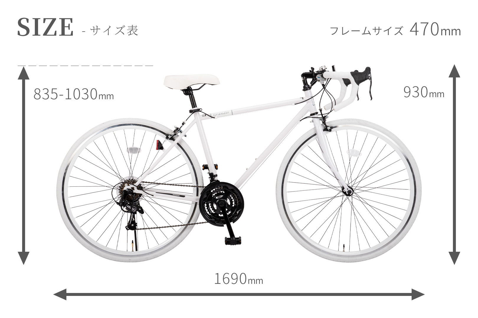車体 横169×高さ93×幅44cm サドル高さ [520mm]88.5から108cm [470mm]83.5から103cm 前輪のみクイックレバー式なので調節は工具不要です。タイヤサイズ:700x28C