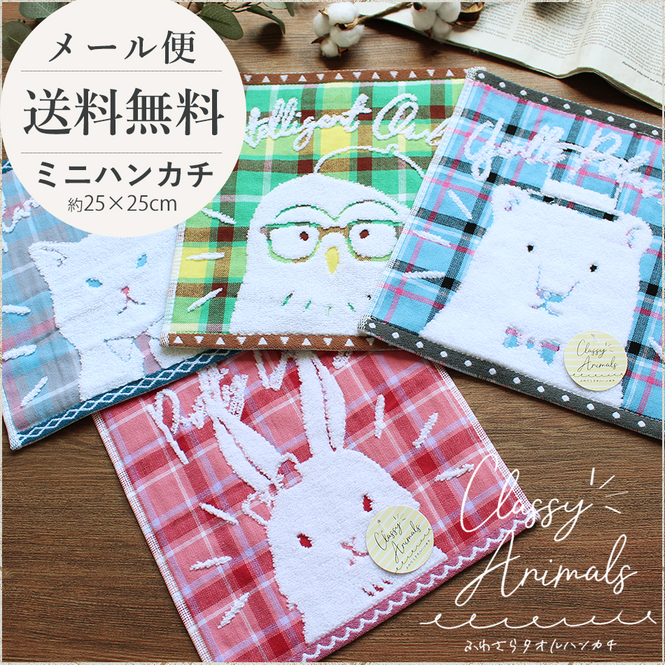 ミニハンカチ 子供 かわいい 動物柄 チェック クラッシーアニマルズ ハンドタオル ガーゼ 綿100 入園準備 ポイント消化