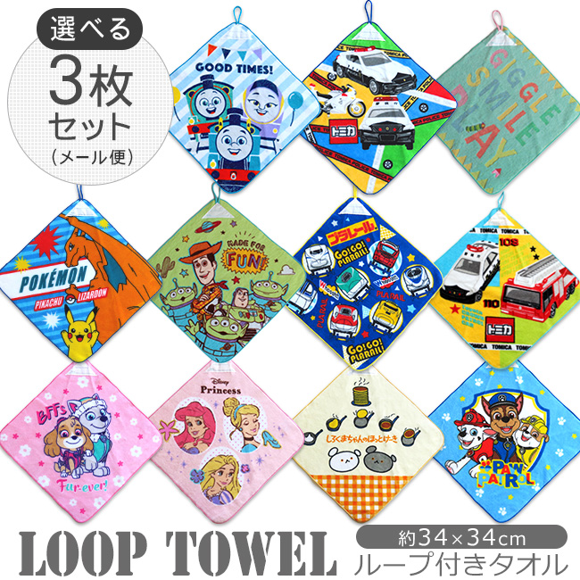 ループ付きタオル 3枚セット まとめ買い お手拭きタオル ネームタグ付き 入園 入学グッズ 保育園 幼稚園 タオルハンカチ ひっかける 子供 ポイント消化