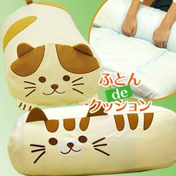 布団を使用しない季節、通常は押入れの中に収納していますが使わない布団をインテリアで活用できたら…。 「布団deクッション」は専用の収納袋に掛け布団を入れてかわいい猫型クッションとして活用できます。 そうすることにより押入れのスペースを他の収納に使うことのできる便利グッヅです。 布団の出し入れが簡単なファスナー形状で、袋は丸洗いができます。 かわいい猫型のデザインで「ぶち」と「とら」の2パターンがあります。